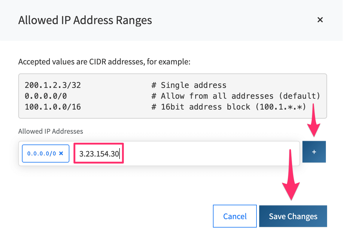 Add the Hasura IP address that you copied, click on the + and then click on Save changes: