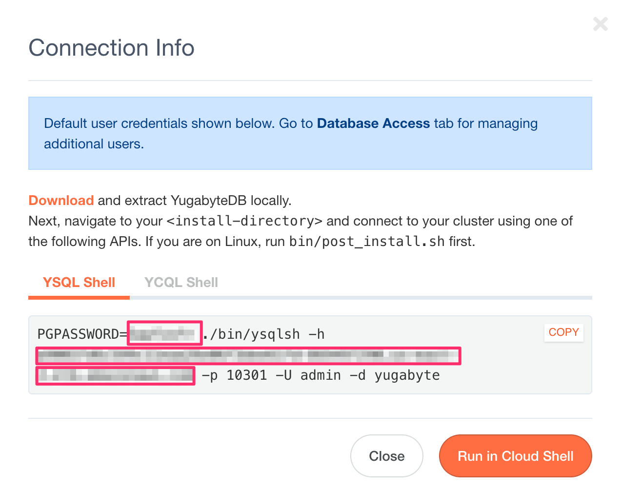 user-name: If you have a separate database user, the user name will be their name. If you didn’t specify a user, the default user name isadmin(see after-Uin the screenshot above).password: If you have a separate database user, use their password. Otherwise, use the password is what followsPGPASSWORD=in the screenshot above.public-ip: The public IP is what follows-hin the screenshot above.postgres-port: The port is10301(see on the screenshot after-p). This can be configured if required.db: The DB isyugabyte(see on the screenshot after-d).
