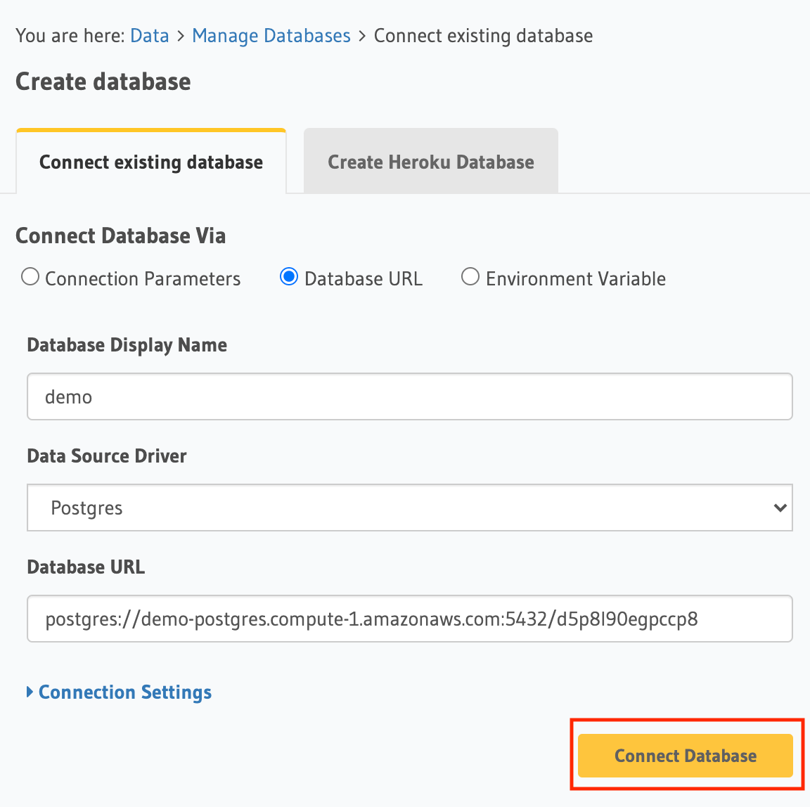 To use an existing database, choose Connect existing database and enter your database connection URL and enter your database connection string (looks like postgres://username:password@hostname:port/dbname).