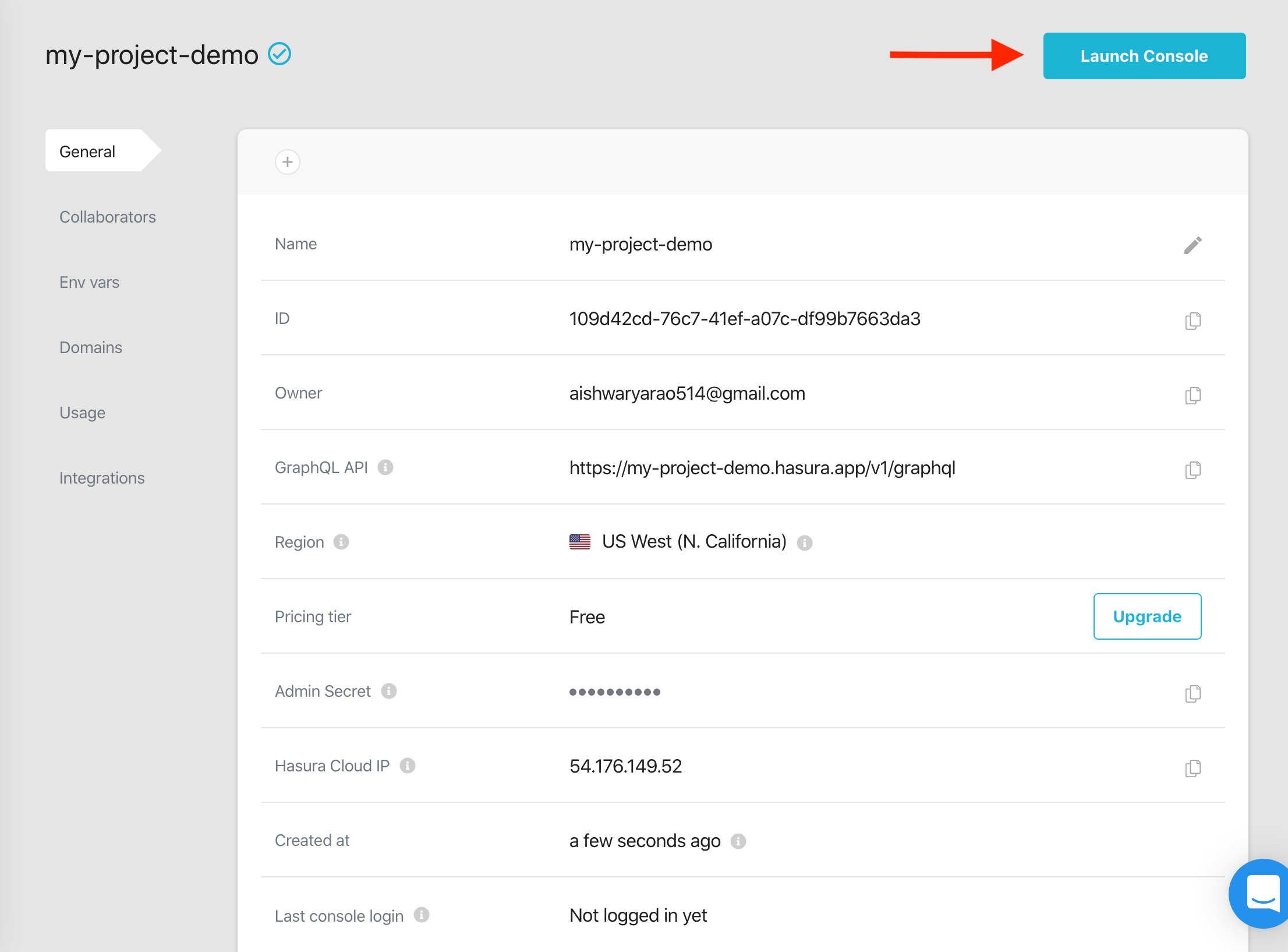 To get started, Click Launch Console to open the Hasura console in your browser.