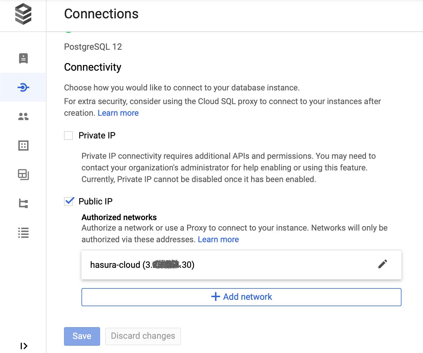 Hasura Cloud IP field whitelist Hasura instance IP in Postgres settings