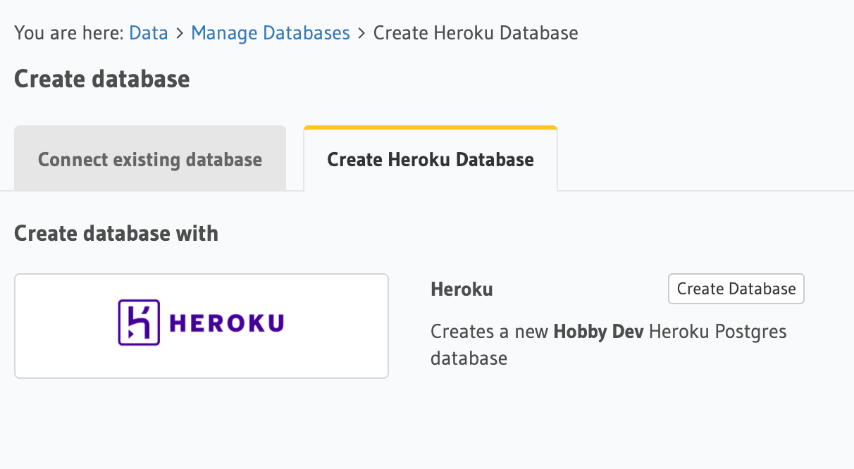 To get started, choose Create Heroku Database -> Create Database, and follow the prompts to authenticate with Heroku. Hasura Cloud will integrate with your Heroku account and manage the initial setup of a dev-tier Postgres instance. You can always upgrade the instance and manage options later through your Heroku account.