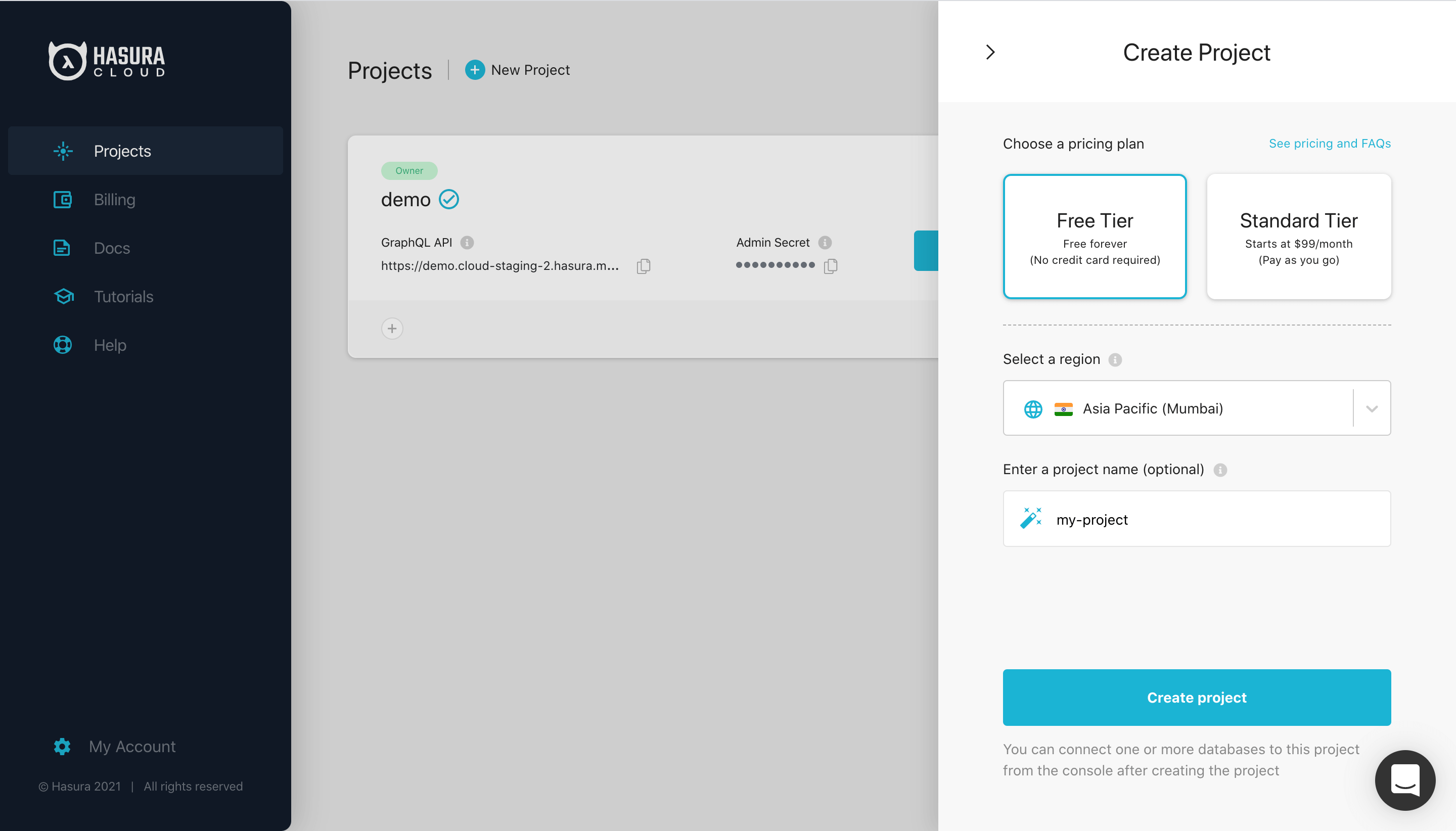 Choose a pricing plan, select a region and optionally enter the project name for your project in this form.