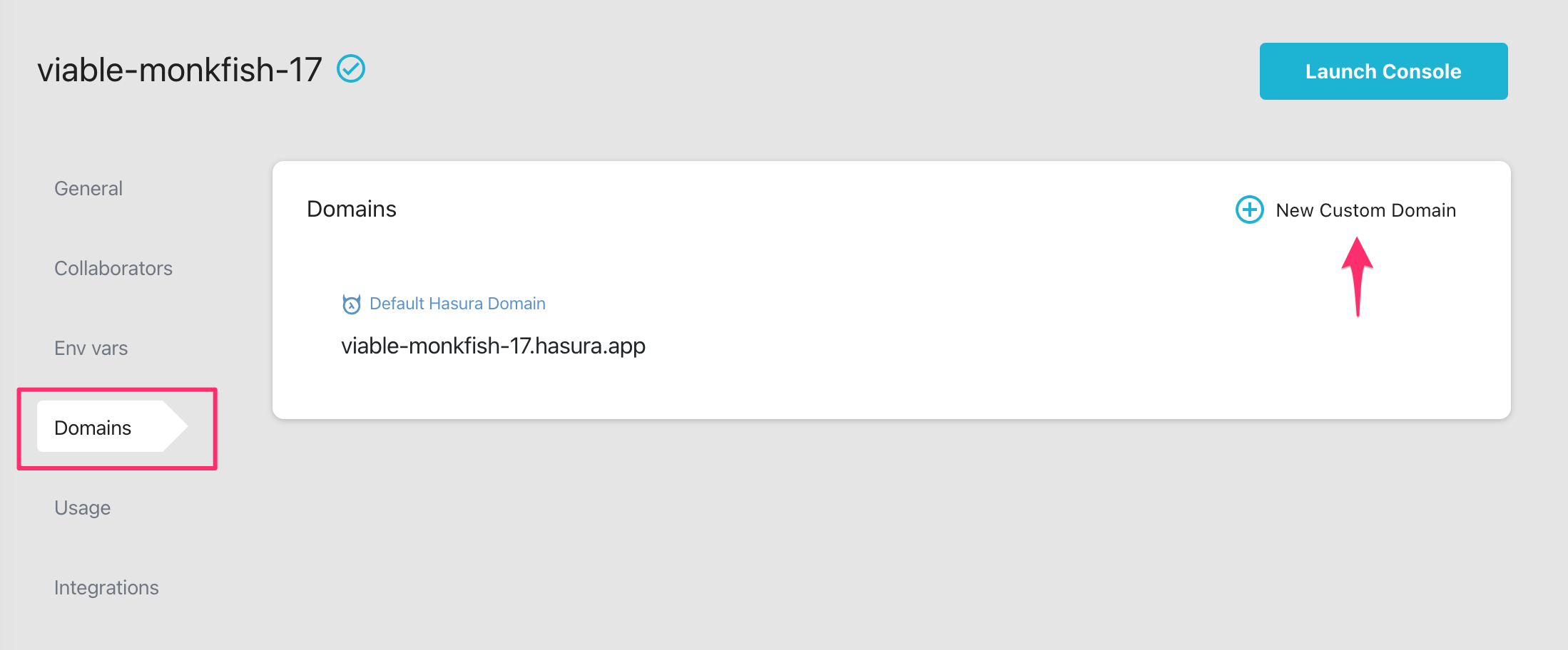 In the Domains tab, you can see the default Hasura domain, and you have the possibility to add custom domains.