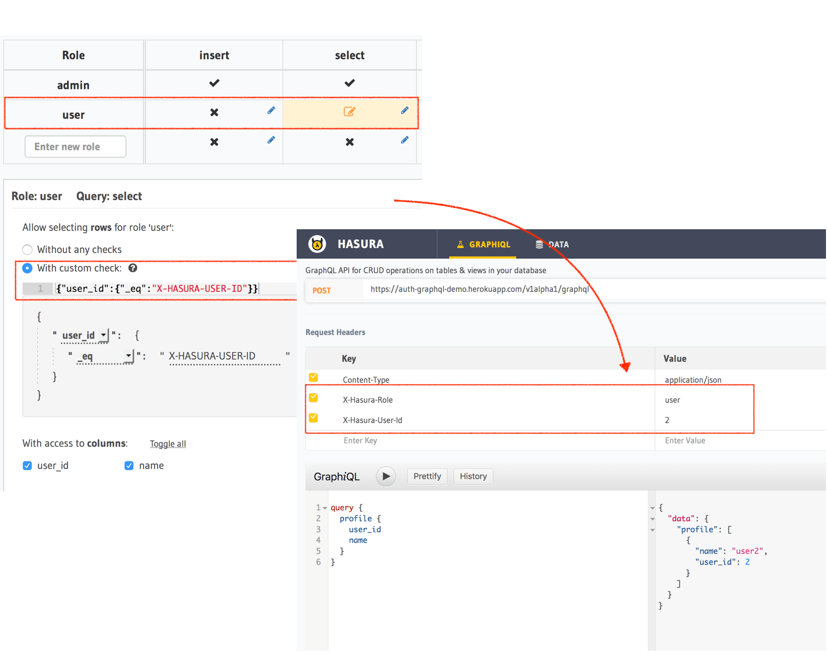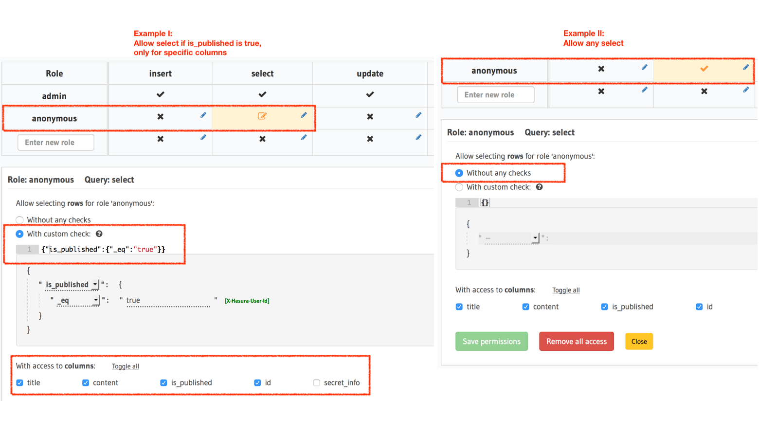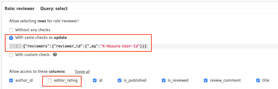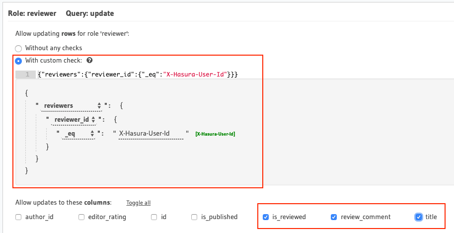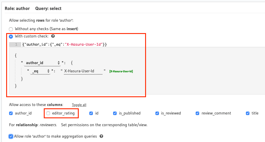 author_id: {_eq: "X-Hasura-User-Id"}for an article table. - Note that the