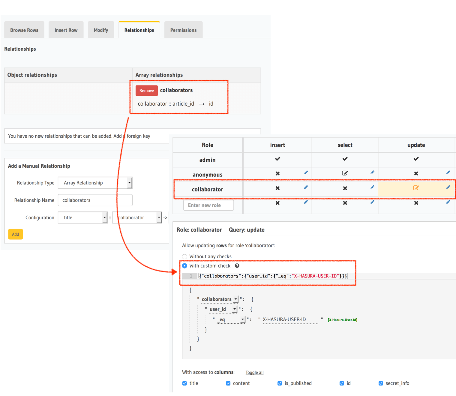 articletable, which has the condition:collaborators: {collaborator_id: {_eq: "X-Hasura-User_id"}}.- This reads as: Allow the role collaborator to select if