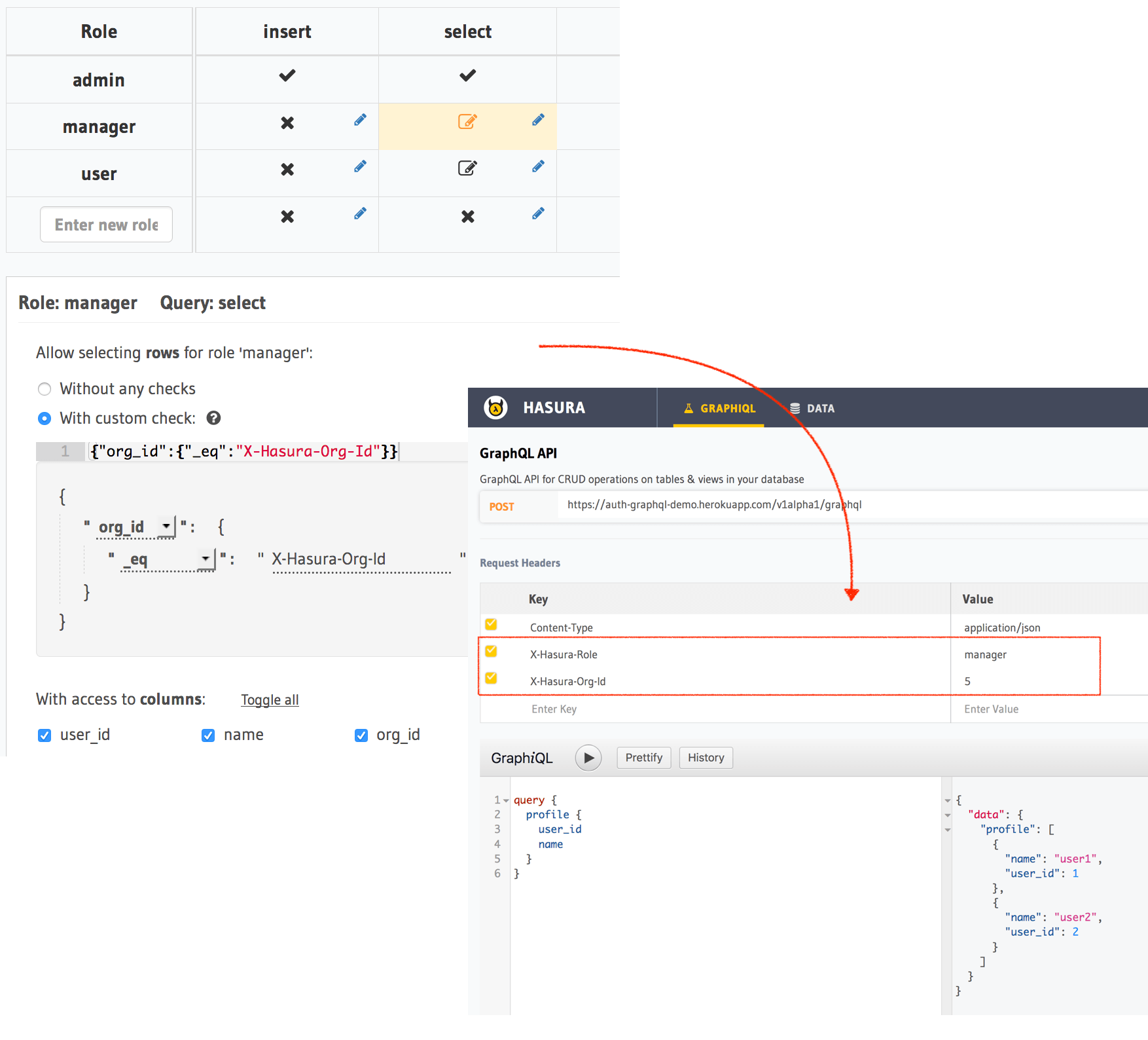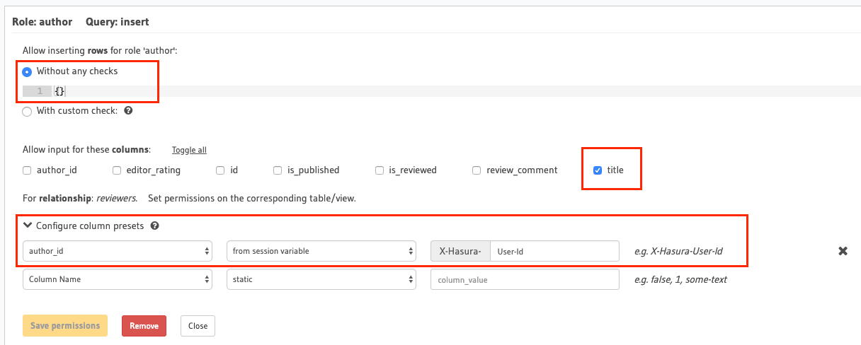 authorto insert only their own articlesFor this permission rule, we’ll make use of two features of the GraphQL engine’s permissions system: