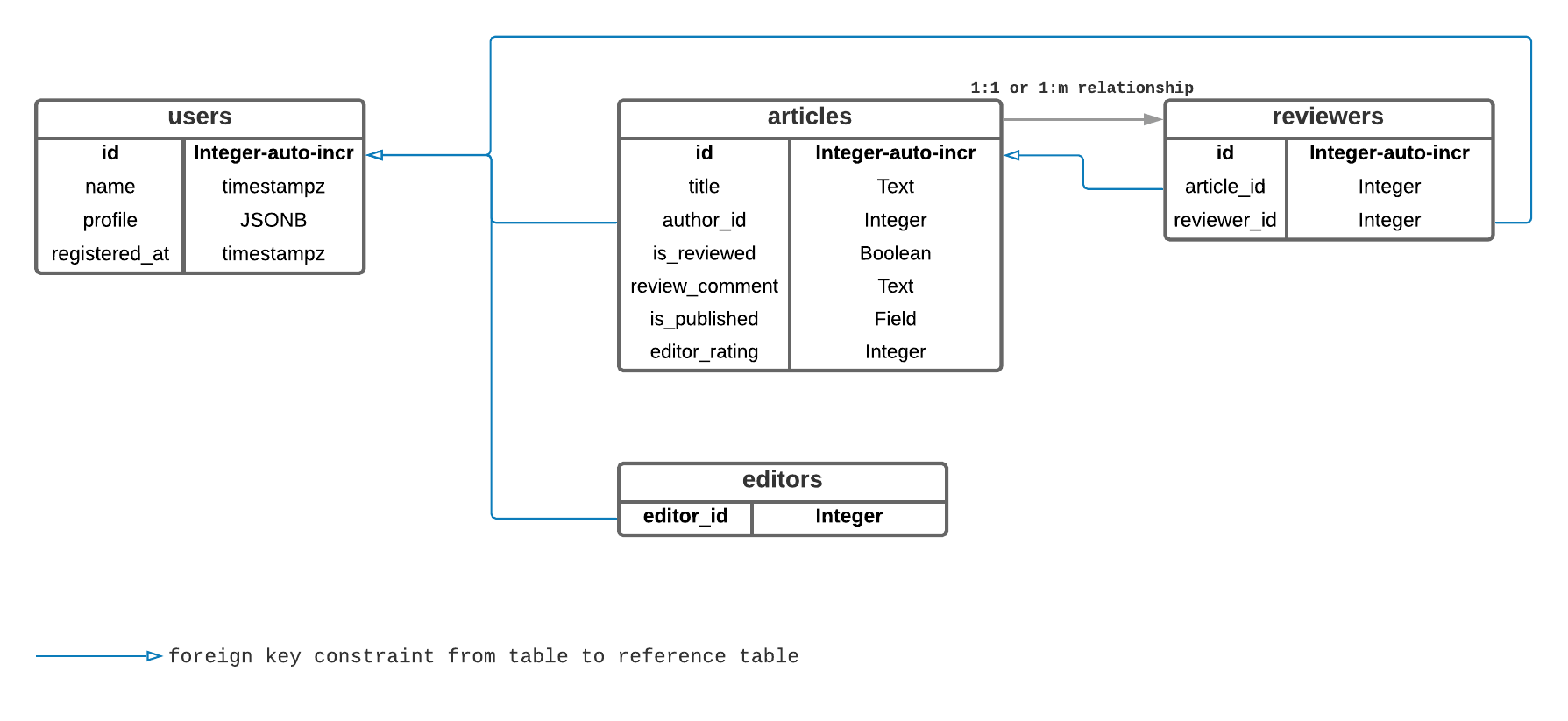 editor_id INTEGER PRIMARY KEY REFERENCES users(id) -- Foreign key to users :: id