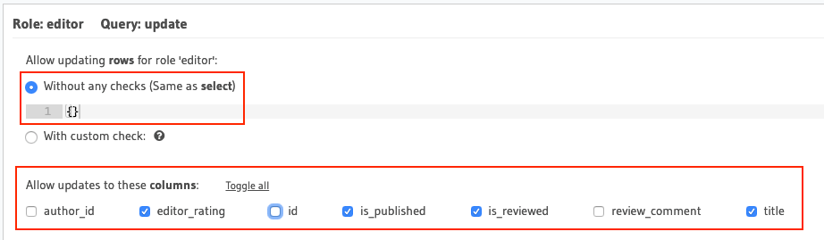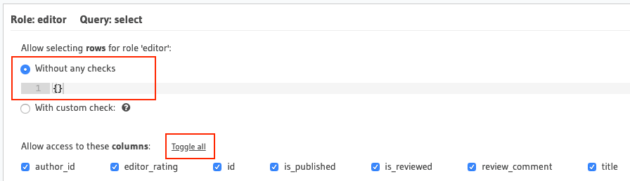 Without any checks, represented by a{}. - Choose the right set of columns that will get exposed in the GraphQL schema as fields. Ensure that sensitive information will not be exposed.