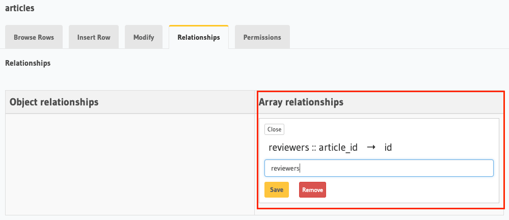 Create an array relationship named reviewers based on the foreign key constraint reviewers :: article_id → articles :: id: