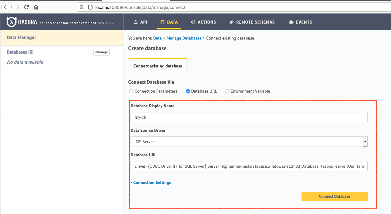 your MS SQL Server as a source to Hasura. You’ll need your ODBC connection string. Make sure that