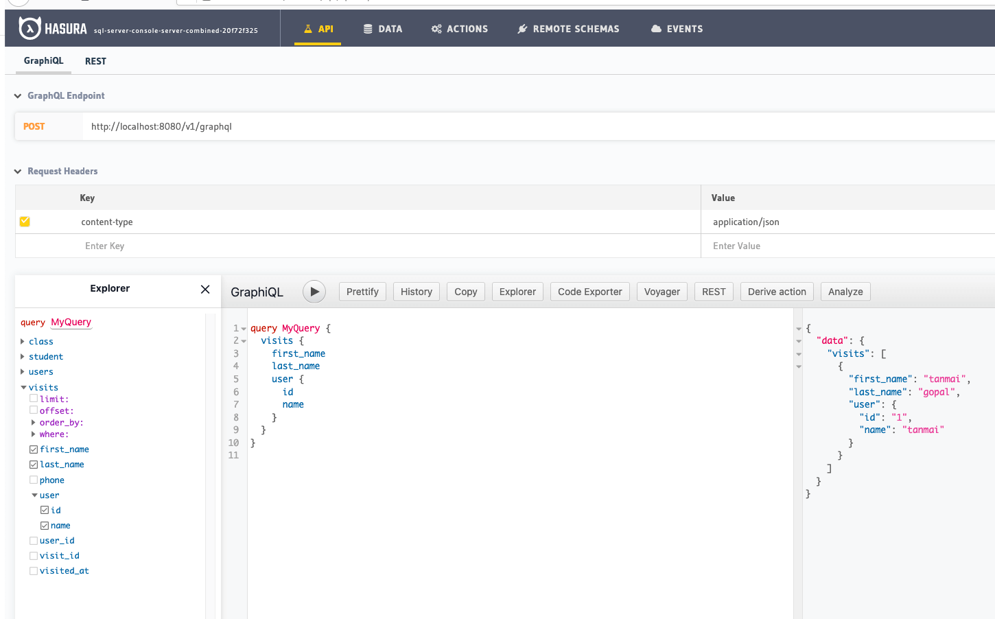 Head to the GraphiQL tab in the console and try running a GraphQL query! Use the explorer sidebar on GraphQL to get help in creating a GraphQL query.