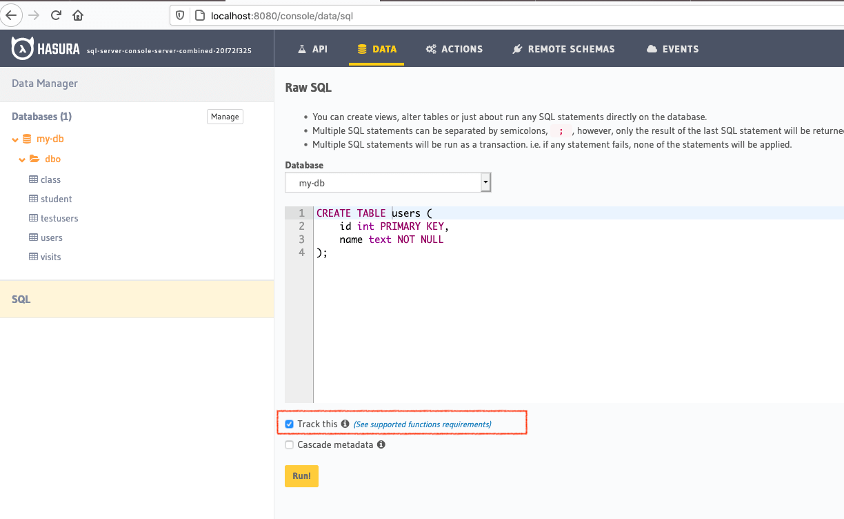 Don’t forget to check “track metadata” at the bottom to make sure Hasura tracks your new database objects in its GraphQL schema.