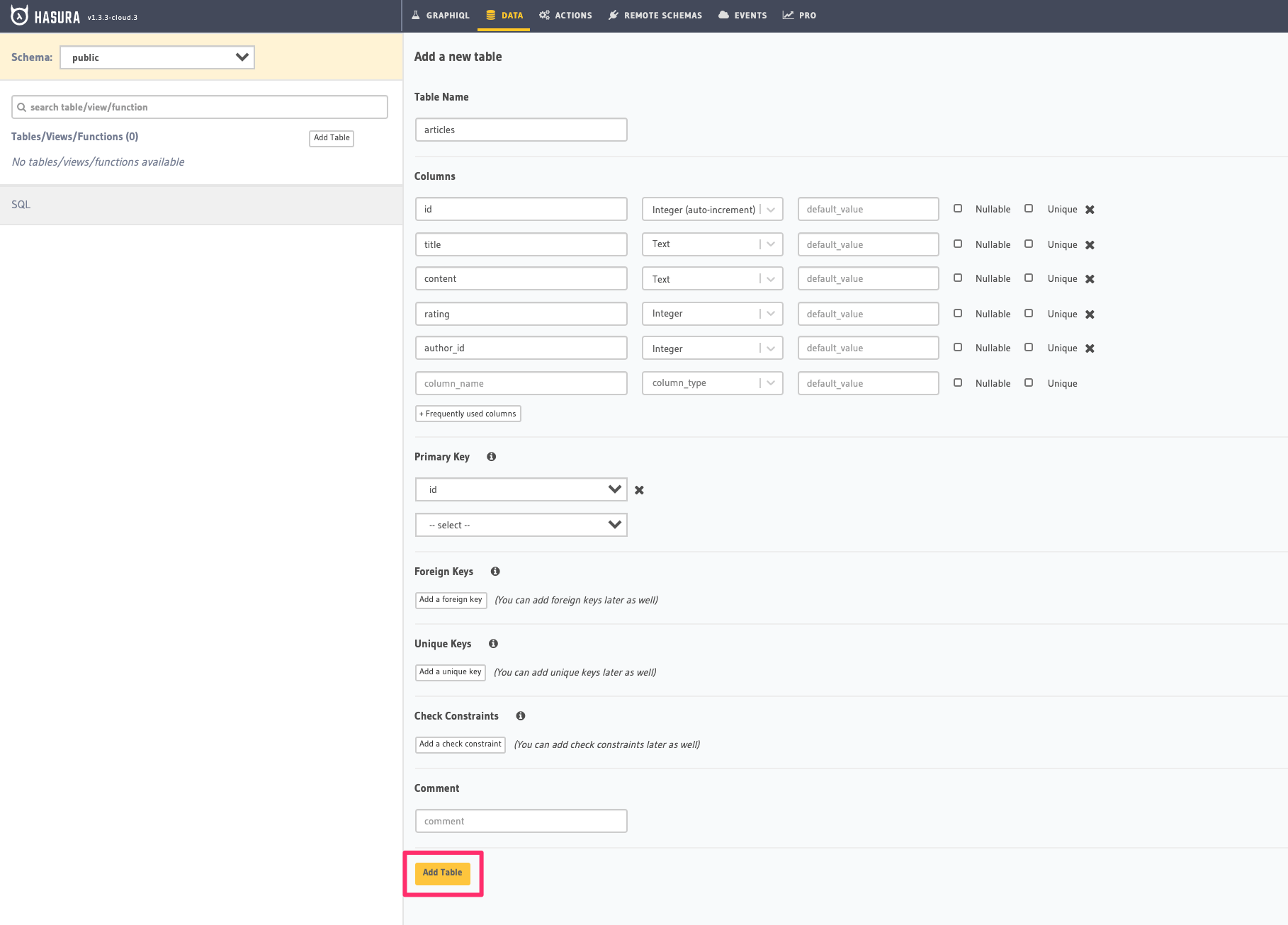 Adding tables allows you to define the GraphQL types of your schema including their corresponding fields.