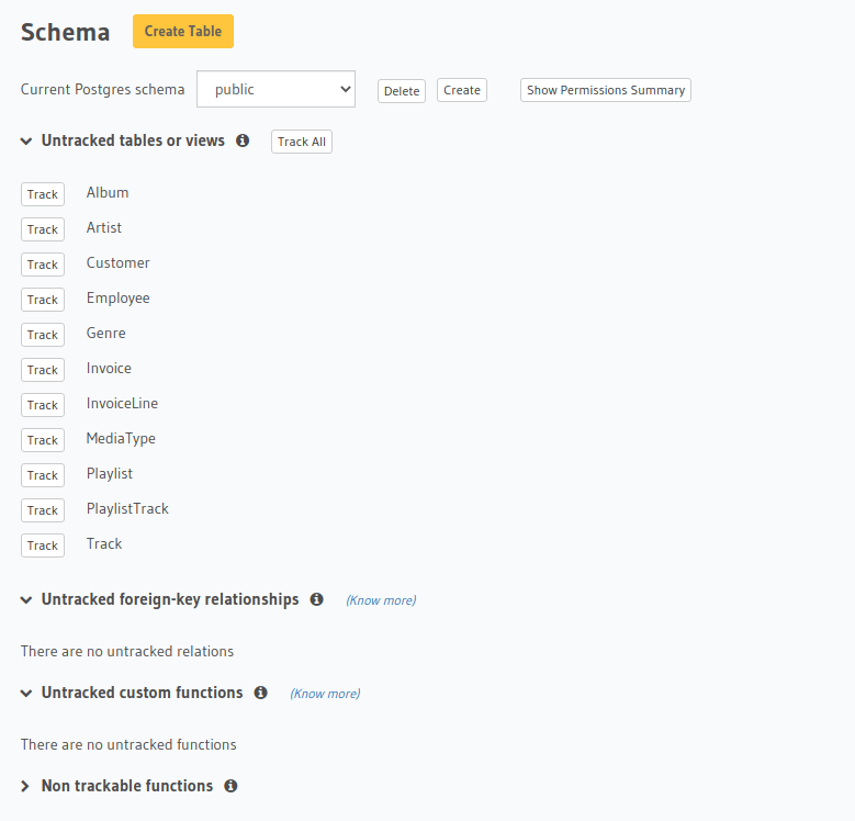 As soon as a table is created and tracked, the corresponding GraphQL schema types and query/mutation fields will be automatically generated.