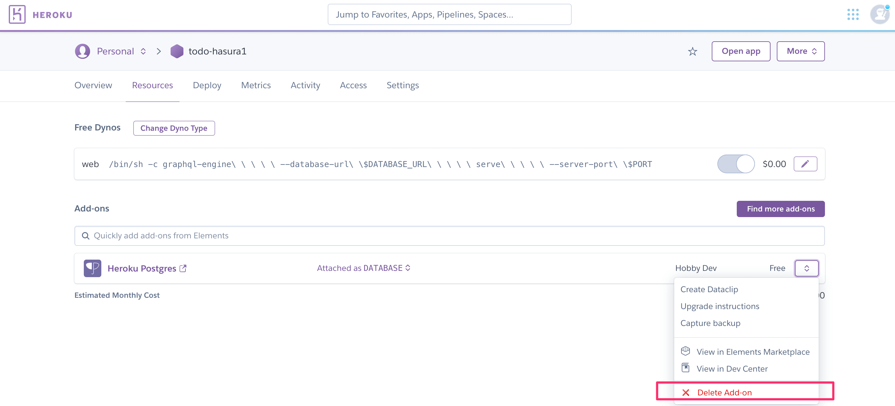 Head to your Heroku dashboard and delete the Postgres add-on created in the previous step: