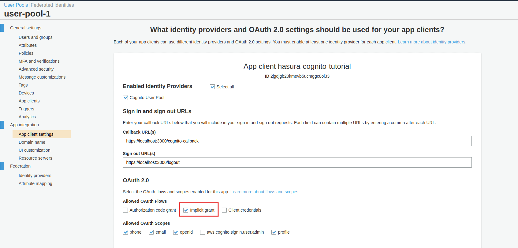 to set up a user pool, add an app and enable the hosted web UI in AWS cognito. While enabling the hosted web UI, you need to select the checkbox Implicit Grant.